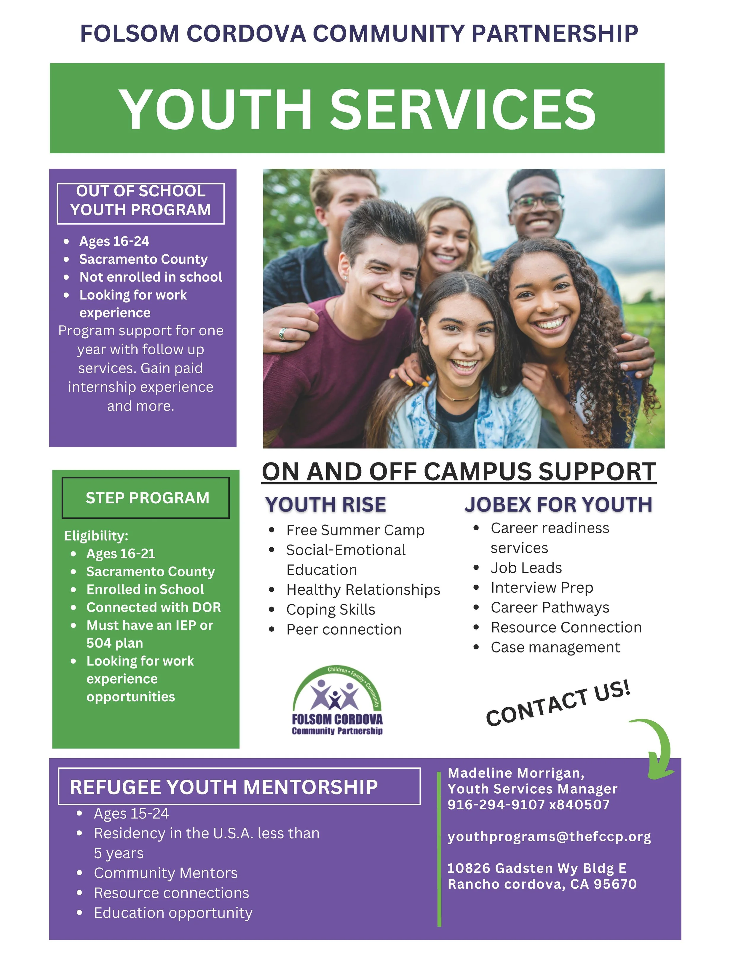 If you would like more information about our Youth Services, please contact Madeline Morrigan, Youth Services Manager, at MMorrigan@theFCCP.org or 916-294-9107 ext. 840503.